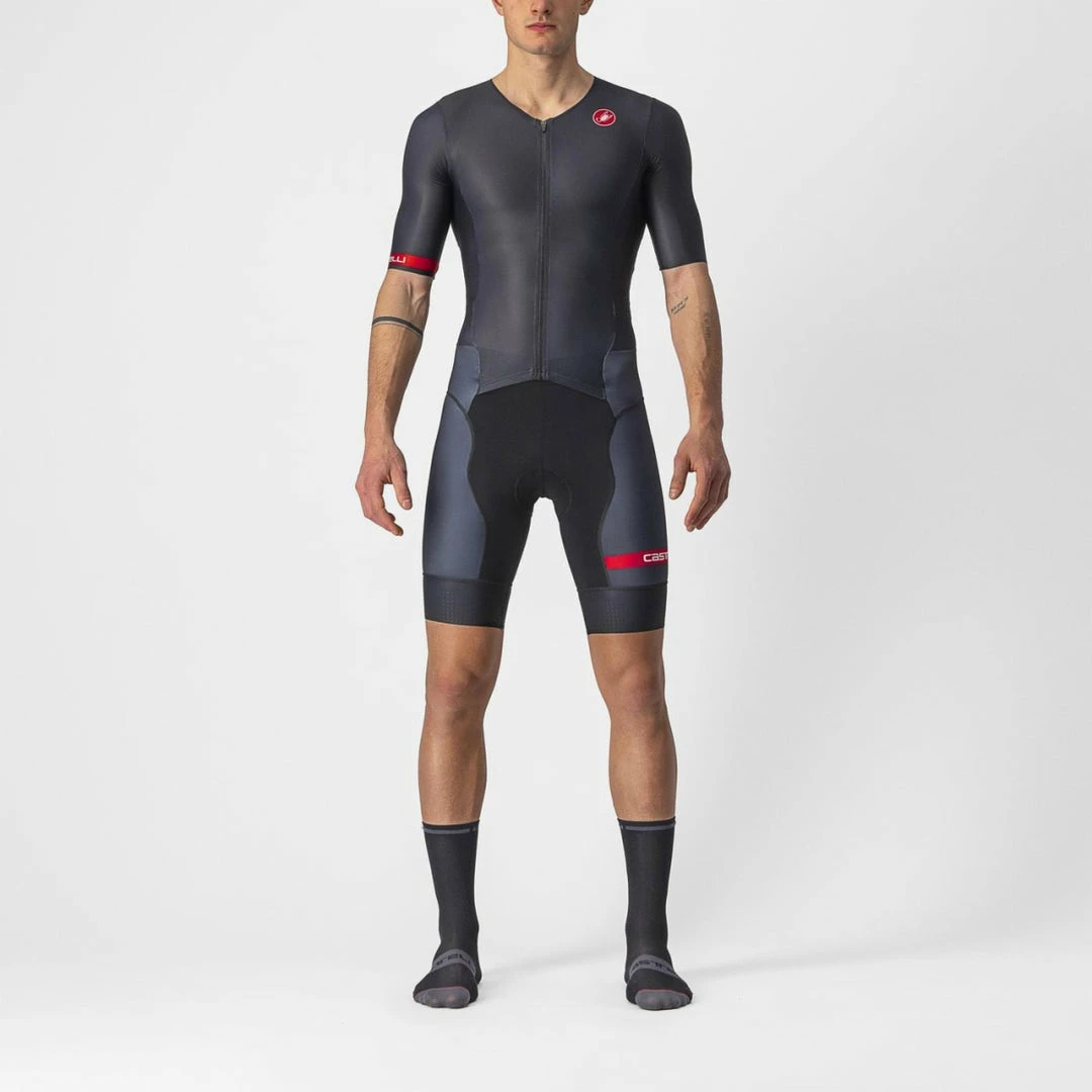 The Castelli Free Sanremo 2 Short Sleeve Triathlon Suit is a performance race suit ideal for 70.3 and full-distance racing.Β The Castelli Free Sanremo 2 Short Sleeve Triathlon Suit has aerodynamics for speed, without compromising pockets and comfort to help you through the big race.