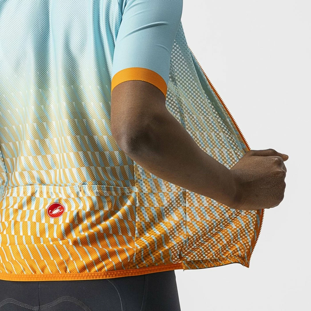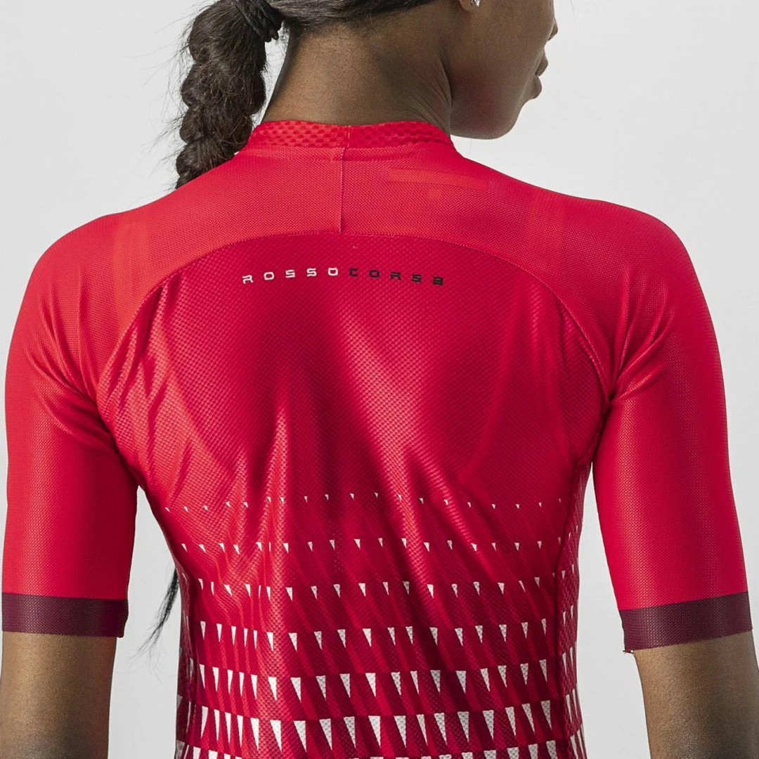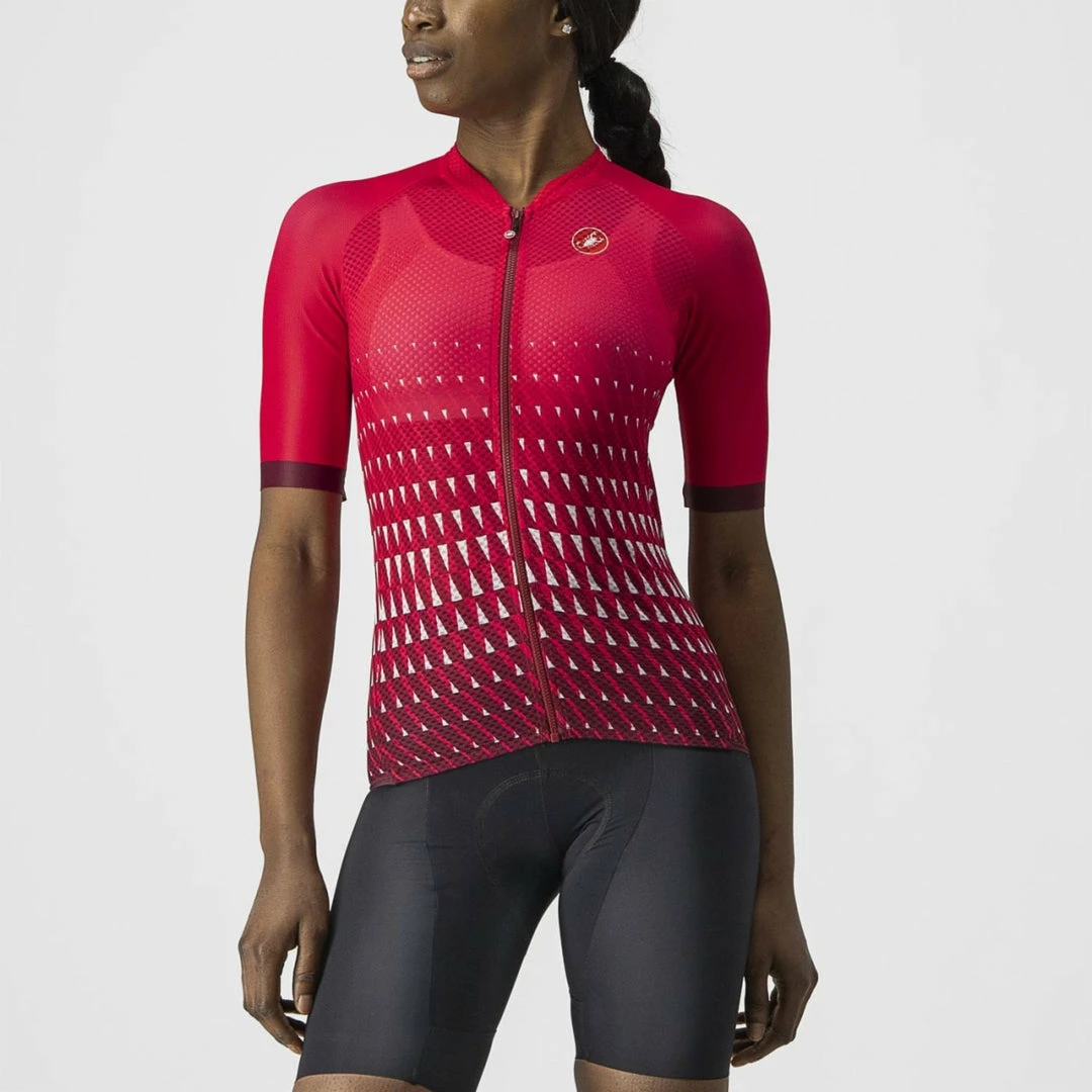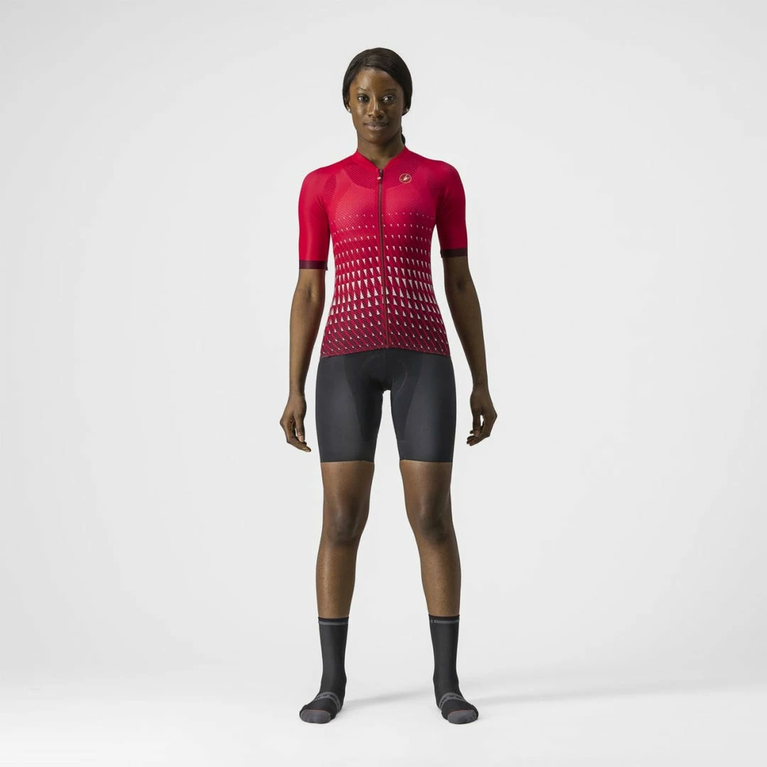 The Castelli Women’s Climber’s 2.0 Cycling Jersey is created for hot weather! The Castelli Women’s Climber’s 2.0 Full-Zip Short-Sleeve Cycling Jersey allows ample airflow through the front fabric, it is quick to dry and blocks more than 90% of UV rays on your back. The Castelli Women’s Climber’s 2.0 Cycling Jersey is a great choice for your long summer rides, or add a base layer and it’s a three-season jersey.