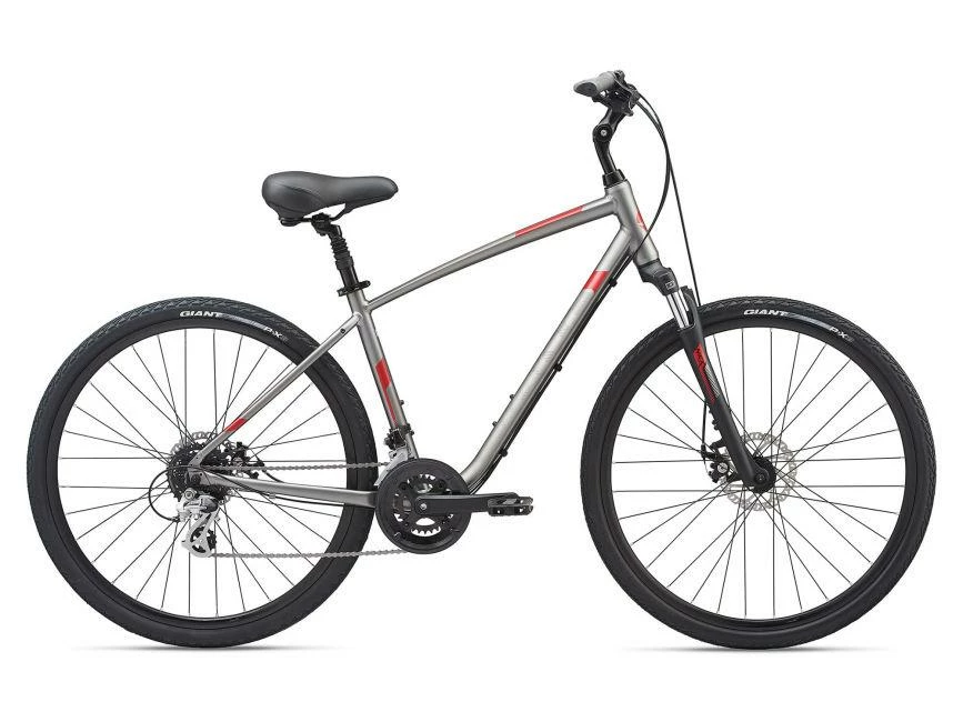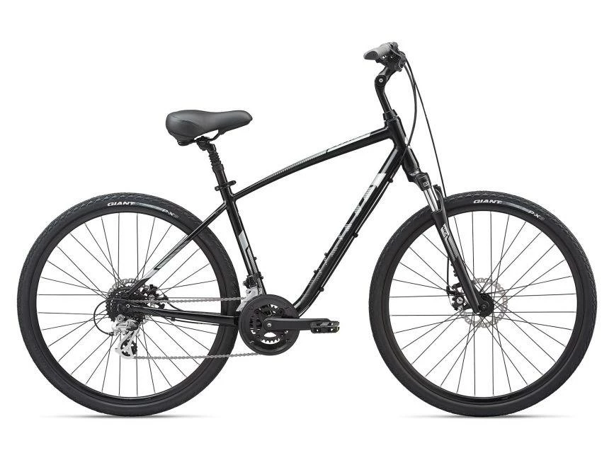 Smooth-rolling 700c wheels give the Giant Cypress DX Disc Hybrid bike a comfortable ride, even when things get a little bumpy. The suspension seatpost soaks up shocks, and the ALUXX aluminum frame provides a comfortable, upright ride. You can take it on roads or bike paths, even some dirt. Just keep pedaling and enjoy the ride.