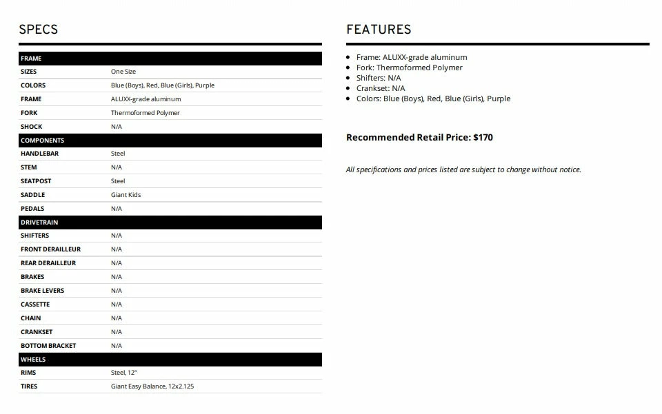 This fun little push bike features a sleek design built around a lightweight yet durable aluminum frame and an innovative high-strength thermoformed polymer fork. It has a low stand-over height that makes it more manageable for small riders, and its smooth-rolling 12-inch wheels, along with a footrest, will help him get the hang of balancing on two wheels.