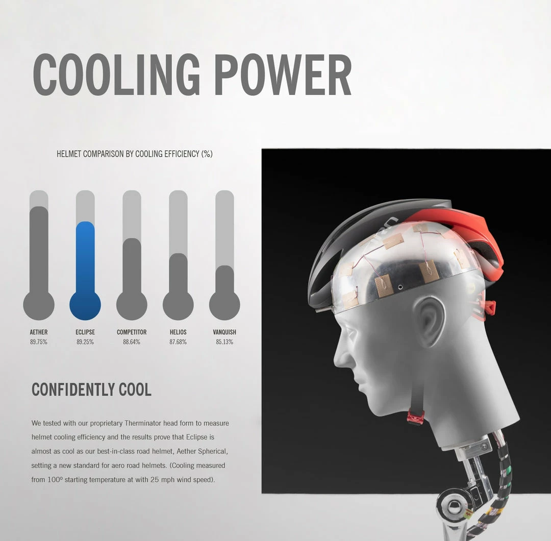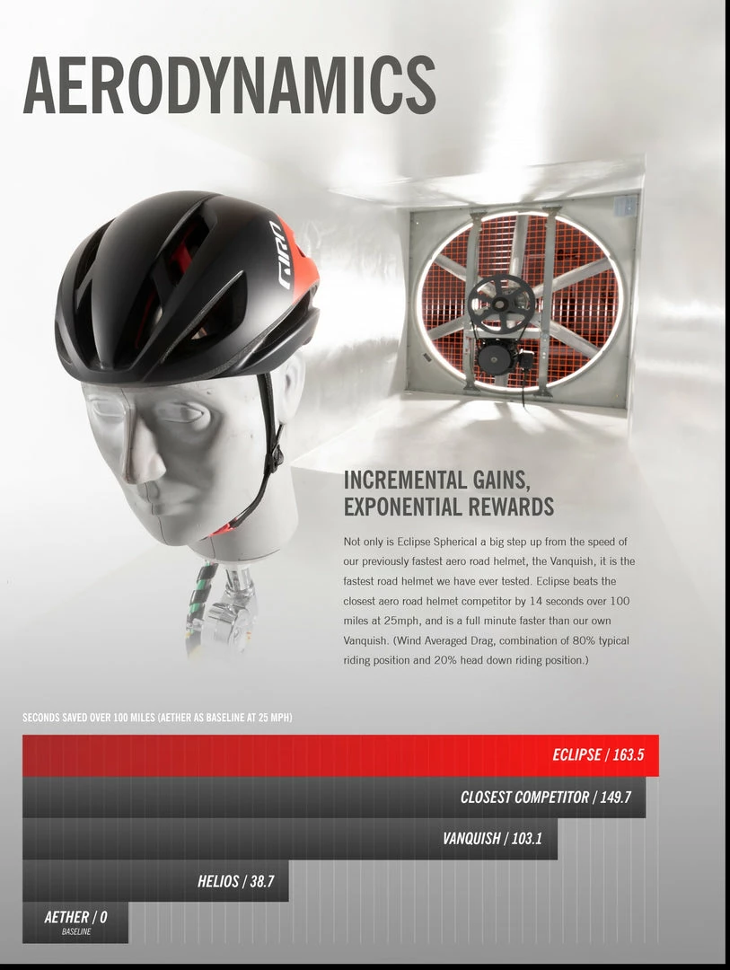Not only is the Giro Eclipse Spherical Road Bike Helmet a big step up from the speed of Giro’s previously fastest aero road helmet, the Vanquish, it is the fastest road helmet Giro has ever tested. The Giro Eclipse Spherical beats the closest aero road helmet competitor by 14 seconds over 100 miles at 25mph, and is a full minute faster than our Giro’s Vanquish. (Wind Averaged Drag, combination of 80% typical riding position and 20% head down riding position.)