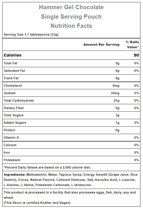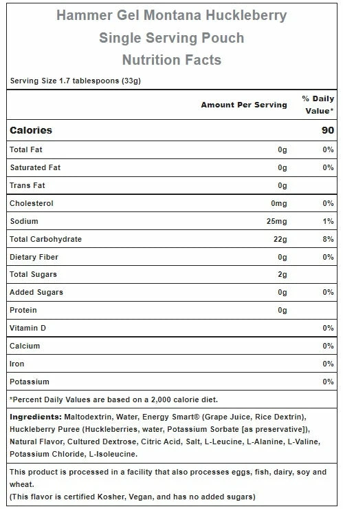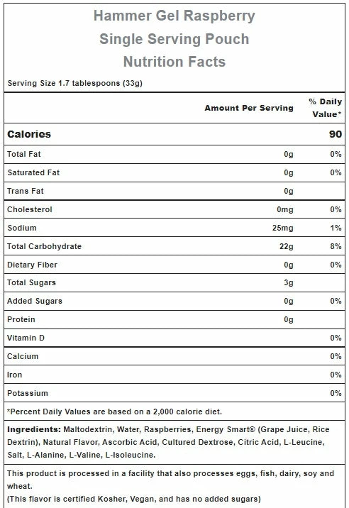 - Energy Smart® (Grape Juice, Rice Dextrin) – This all-natural, low-sugar sweetener plays an important role in Hammer Gel’s delicious flavor while contributing minimally to the overall carbohydrate content. Energy Smart® is certified non-GMO, gluten-free, and allergen-free.