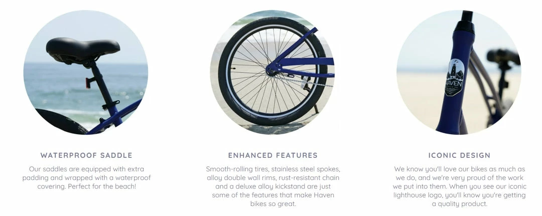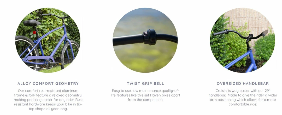 The Haven Pointe 1 Step Over 26″ cruiser bike is equipped with lightweight, relaxed geometry comfort frame you’re looking for. With its rust-resistant aluminum design, ultra comfy waterproof oversized saddle and simple one-speed drivetrain, the Haven Pointe 1 cruiser bike is ready for your cruise around town.