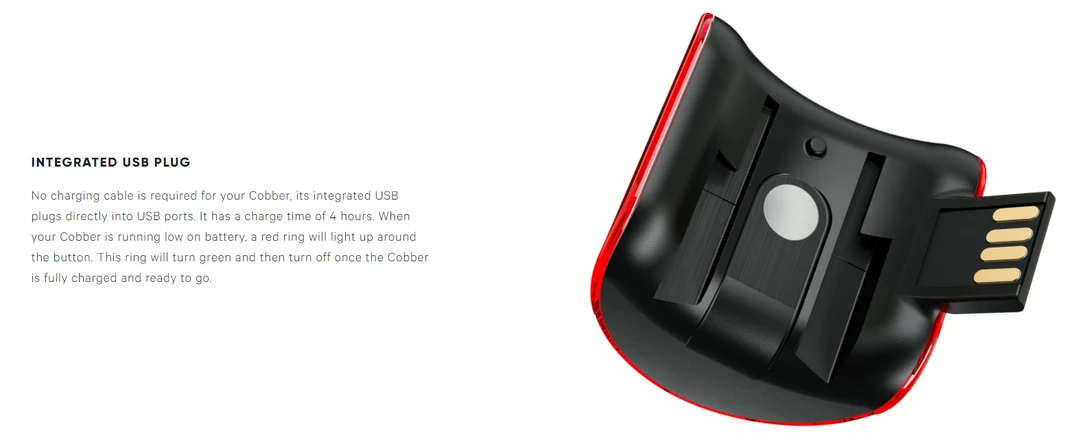 - Integrated USB Plug –Β No charging cable is required for your Knog Lil’ Cobber twinpack, its integrated USB plugs directly into USB ports. It has a charge time of 4 hours. When your Knog Lil’ Cobber twinpack is running low on battery, a red ring will light up around the button. This ring will turn green and then turn off once the Cobber is fully charged and ready to go.