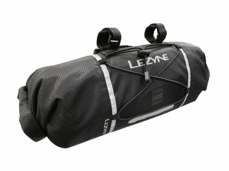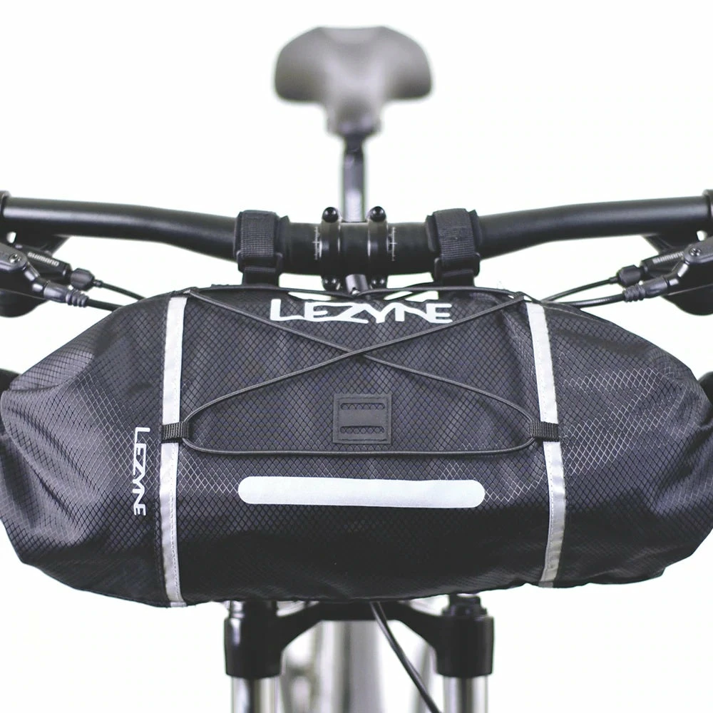 The Lezyne Bar Caddy is a medium capacity handlebar bag designed for ease-of-use and maximum functionality. The Lezyne Bar Caddy handlebar bag has easy access, double sided roll-type enclosures. The Lezyne Bar Caddy is highly water resistant with a compressible design. High quality, durable materials. Adjustable straps and simple velcro mounting system. External draw cords hold extra gear. Reflective features and light mounts add additional safety.