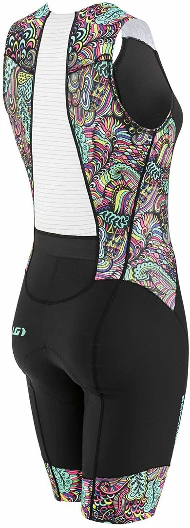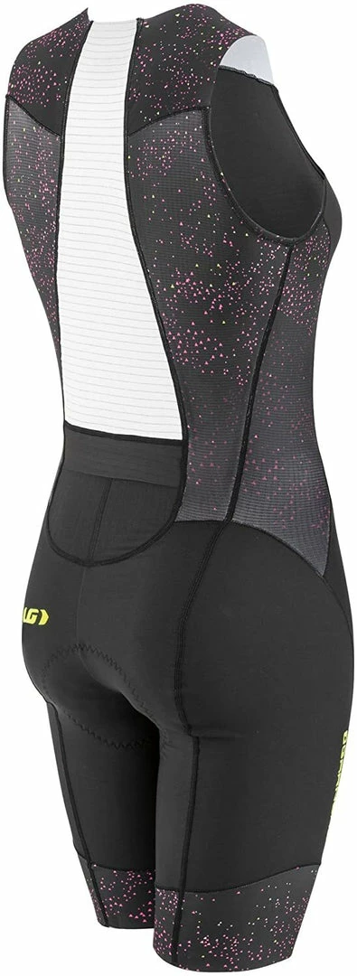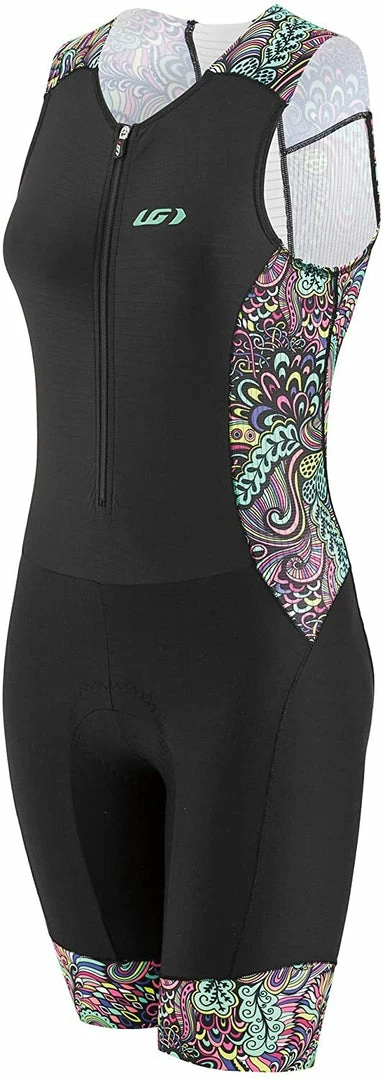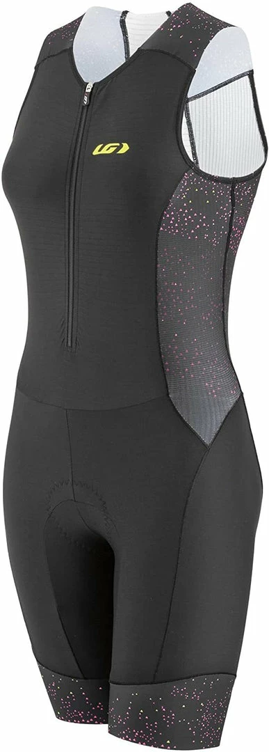 If youโre looking for a fast, comfortable and performance-driven suit, then the Louis Garneau Women’s Pro Carbon Triathlon Suit is for you. Designed to give you optimal aerodynamics, the laser-cut shoulders and Aero Lazer band at the thigh combine to reduce drag. Advanced Coldblackยฎ technology dispels the heat build-up caused by UV rays โ even on dark-coloured gear โ so you can stay cool while youโre pushing yourself hard in the summer heat. The combination of Micro-Activ and flatlock seams eliminates irritation and reduces chafing, while the inner leg is completely seamless, to avoid excess material getting bunched up around the saddle. Reflective accents on the front, back and bottom of the suit help improve visibility in low-light conditions, while the fabrics also provide sun protection up to UPF/SPF 50. The Tri Air chamois is lightweight and treated with antibacterial technology to prevent the build-up of bacteria and odors over time. The quick-drying foam stretches in four directions, providing an excellent range of motion.