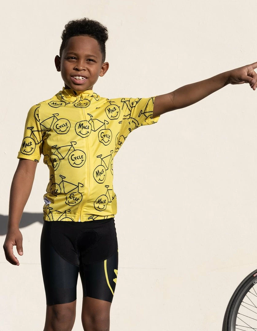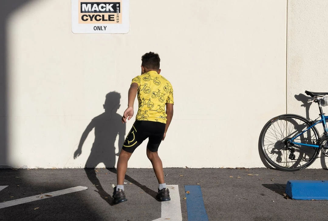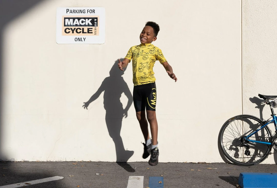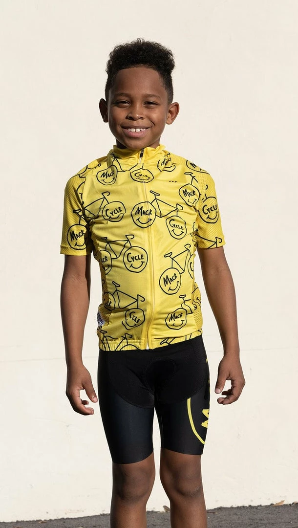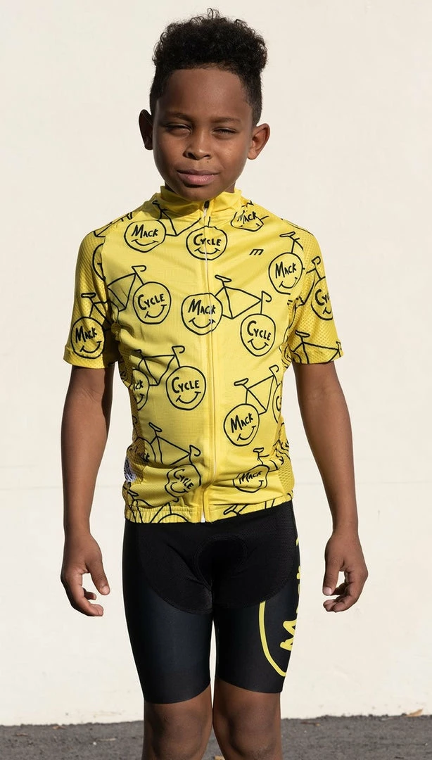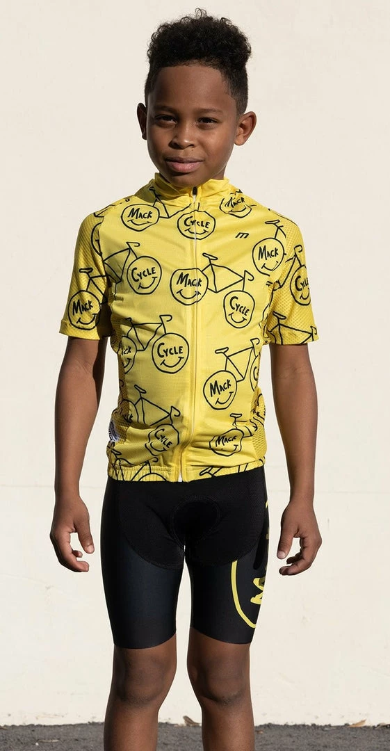 Ride in style with the Mack Cycle Happy Riding Cycling kit.Β This kit includes a full-zip cycling jersey, cycling short, and a comfortable buff to cover your face from the elements when needed.