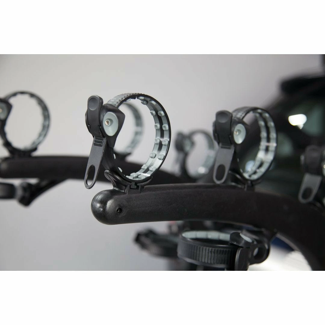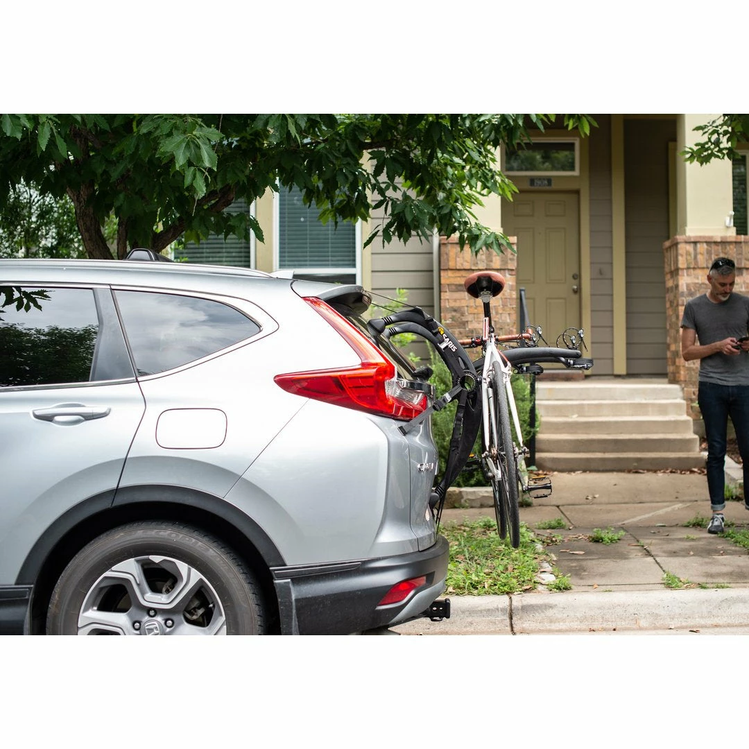 - Best-in-class ratchet straps speedily fasten bike to the rack.