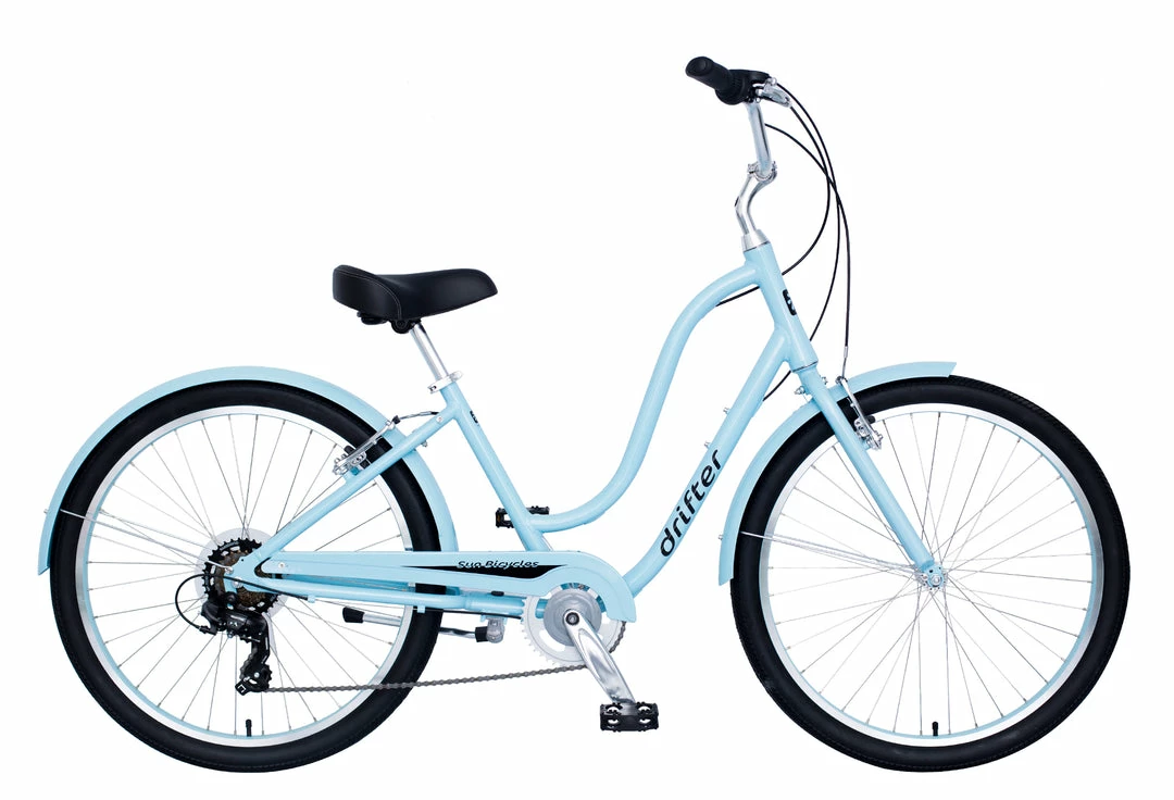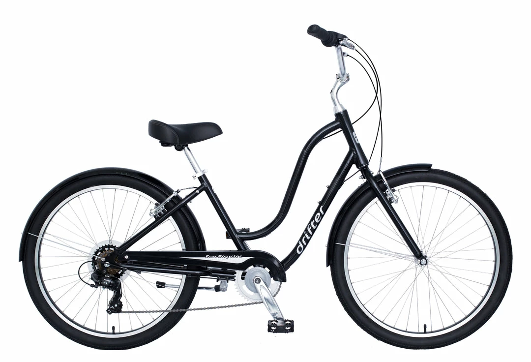 The Sun Drifter 7 Speed Step-Thru Cruiser Bike is the ideal choice for casual rides around the neighborhood, bike path, or wherever your adventure awaits. Sun’s unique Foot Forward pedal placement and easy upright riding position ensure total comfort and stability while riding your Sun Drifter 7 Speed Step-Thru Cruiser Bike. The Foot Forward position allows you to maintain proper saddle height while still having the ability to place your feet on the ground when seated. The Sun Drifter is offered in single-speed, 3-speed internal, 7-speed, and 21-speed versions to accommodate all riders.