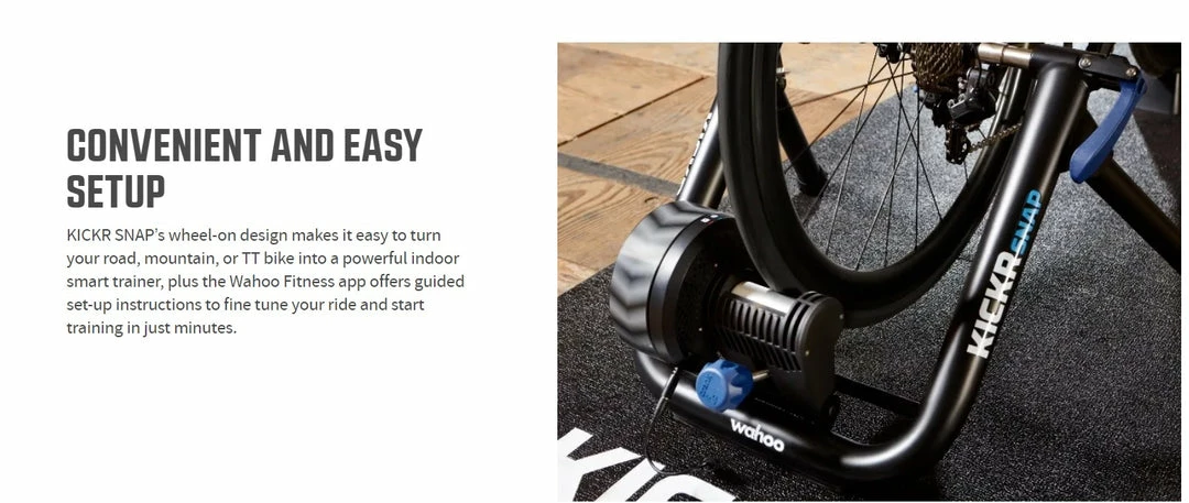 - Convenient Design and Set-up – The wheel-on design of KICKR SNAP makes it easy to turn your road, mountain, or TT bike into a powerful indoor smart trainer.